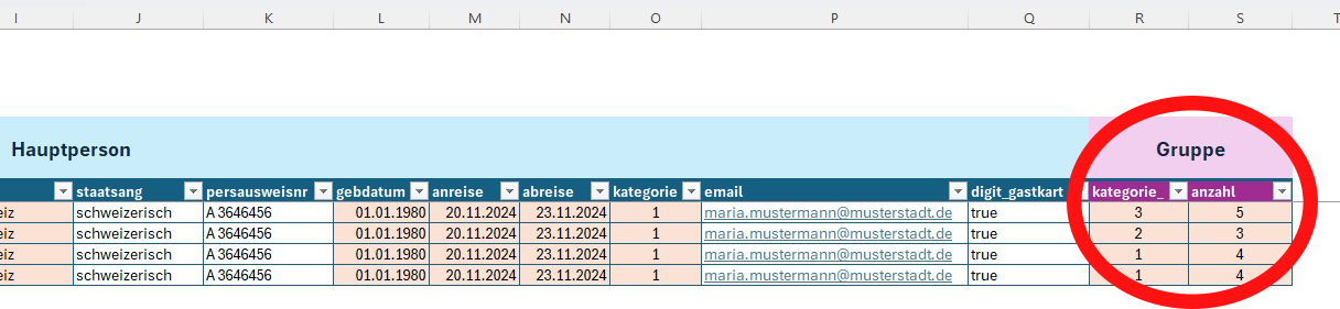 Nochmals der wichtige Hinweis: Pro Begleitperson ebenfalls muss eine neue Zeile erstellt werden. Damit die Teilnehmer dem selben Meldeschein (Hauptperson) zugewiesen werden, muss die Vorname, Name und Anreisedatum mit der Hauptperson identisch sein. Am besten dafür alle Felder der Zeile markieren, kopieren und einfach in der neuen Zeile einfügen. Sobald in einer neuen Zeile eine neue Hauptperson mit neuem Anreisedatum erfasst wird, wird ein neuer Meldeschein erstellt.