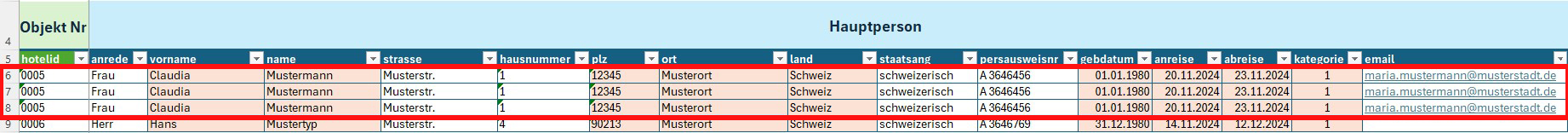 SCHRITT 4: Weitere Kategorien erfassen: Pro Kategorie muss eine neue Zeile erstellt werden. Damit die Teilnehmer dem selben Meldeschein (Hauptperson) zugewiesen werden, muss die hotelid, Vorname, Name und Anreisedatum mit der Hauptperson identisch sein. Am besten dafür alle Felder der Zeile markieren, kopieren und einfach in der neuen Zeile einfügen.