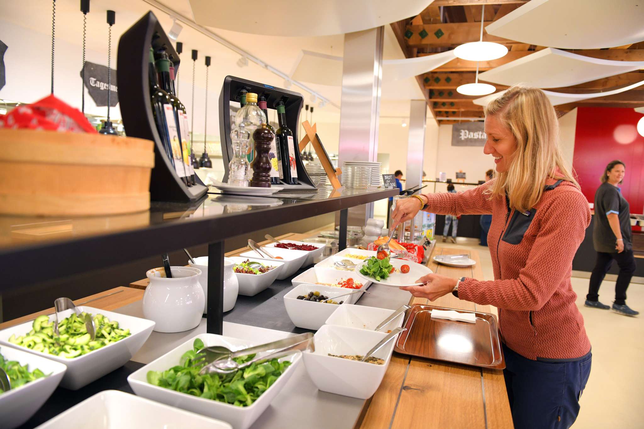 Das moderne Selbstbedienungsrestaurant Ämpächli mit Kaffeebar und grosser Sonnenterrasse ist der zentrale Treffpunkt für Gross und Klein.