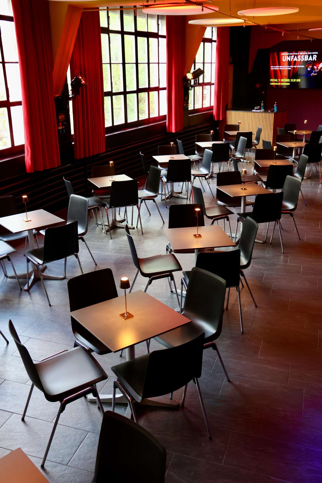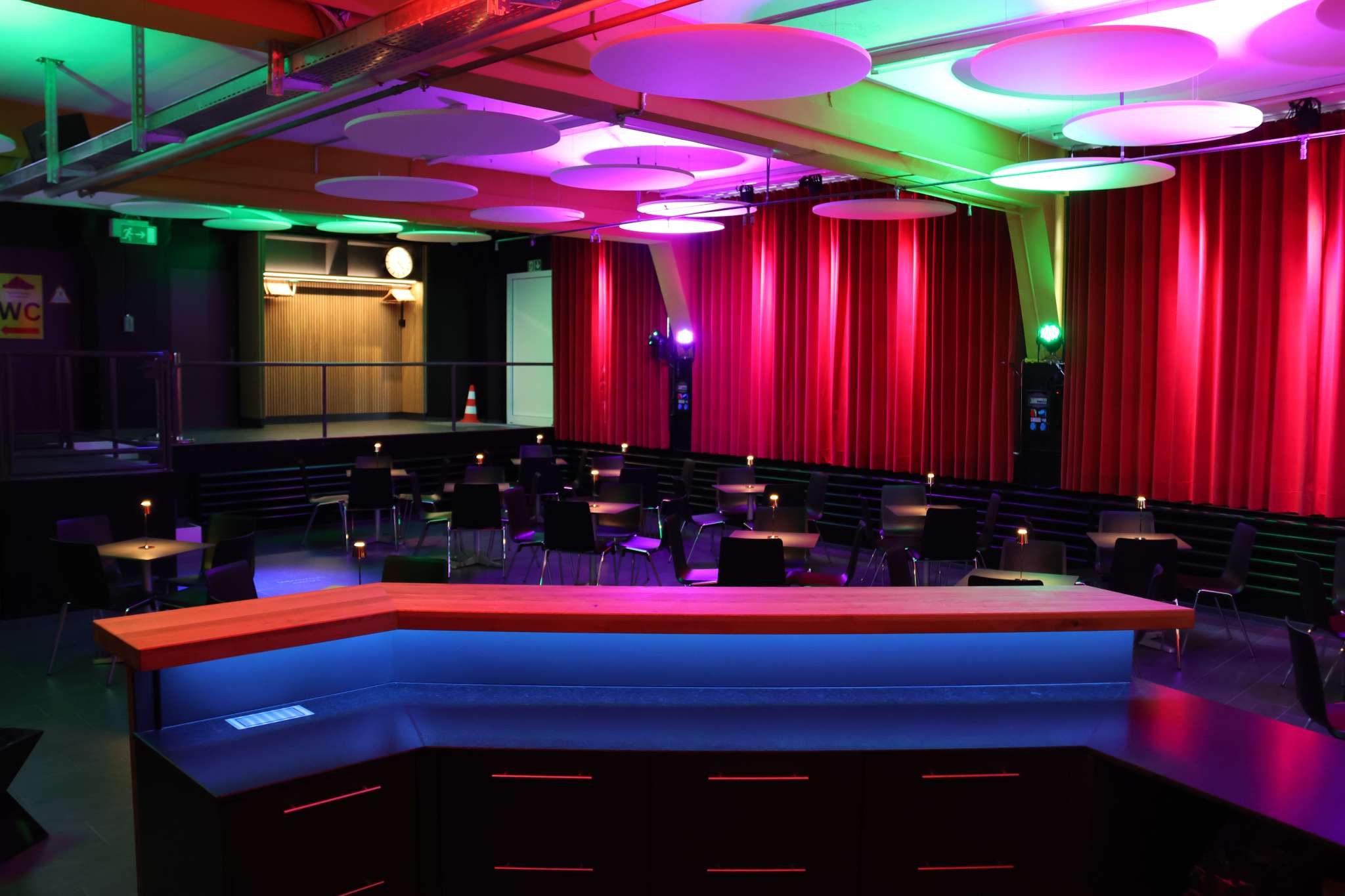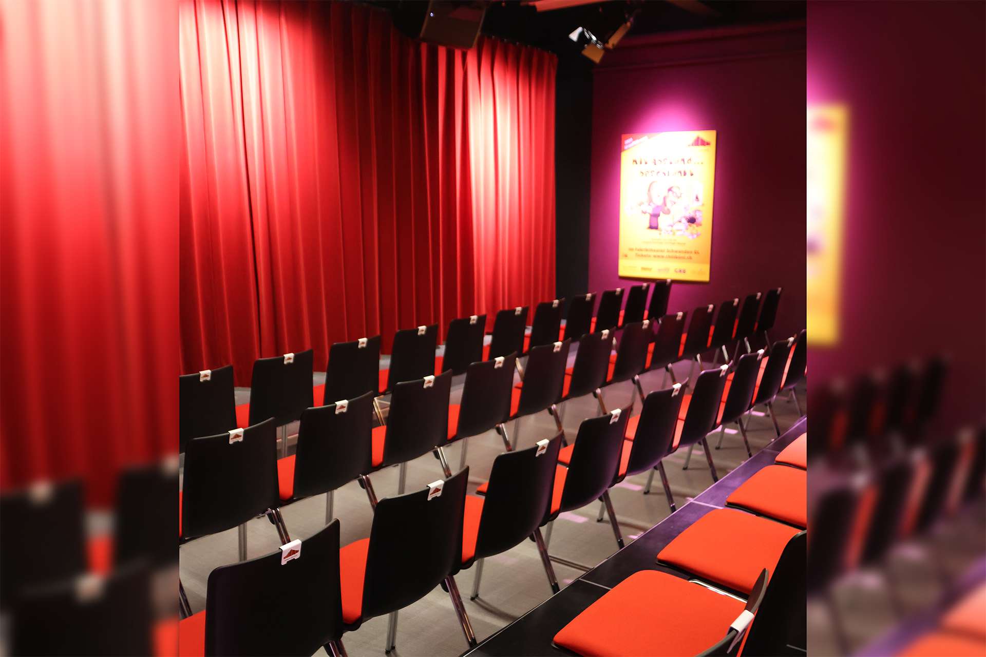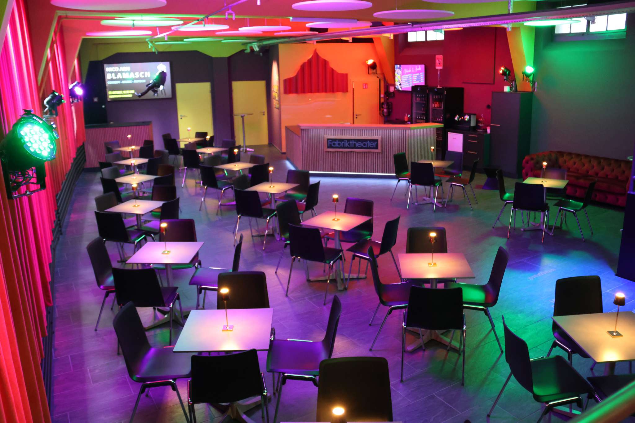 Der Theatersaal bietet 117 Sitzplätze, das gemütliche Bistro rund 60 – ideal für einen unterhaltsamen Abend oder auch für Workshops, Privatfeiern und Firmenevents.