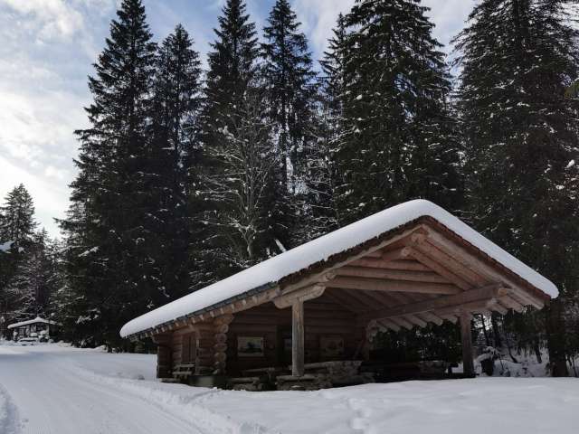 Diese leichte Tour führt über den Skulpturenweg an den Südhang des Hirzlis. Zahlreiche Holzskulpturen des einheimischen Holzbildhauers Thomas Jud säumen den Weg im tief verschneiten Bergwald.