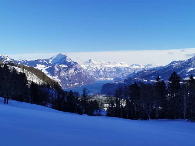 Bei der Blockhütte im Mettmenriet machen wir Rast und stärken uns mit Glühmost und einem «Schneeschuh-Raclette». Über sanfte Hügel gehen wir talauswärts und machen dabei noch einen Besuch im Bergrestaurant Hirzli. Die Luftseilbahn bringt uns sicher wieder ins Tal.