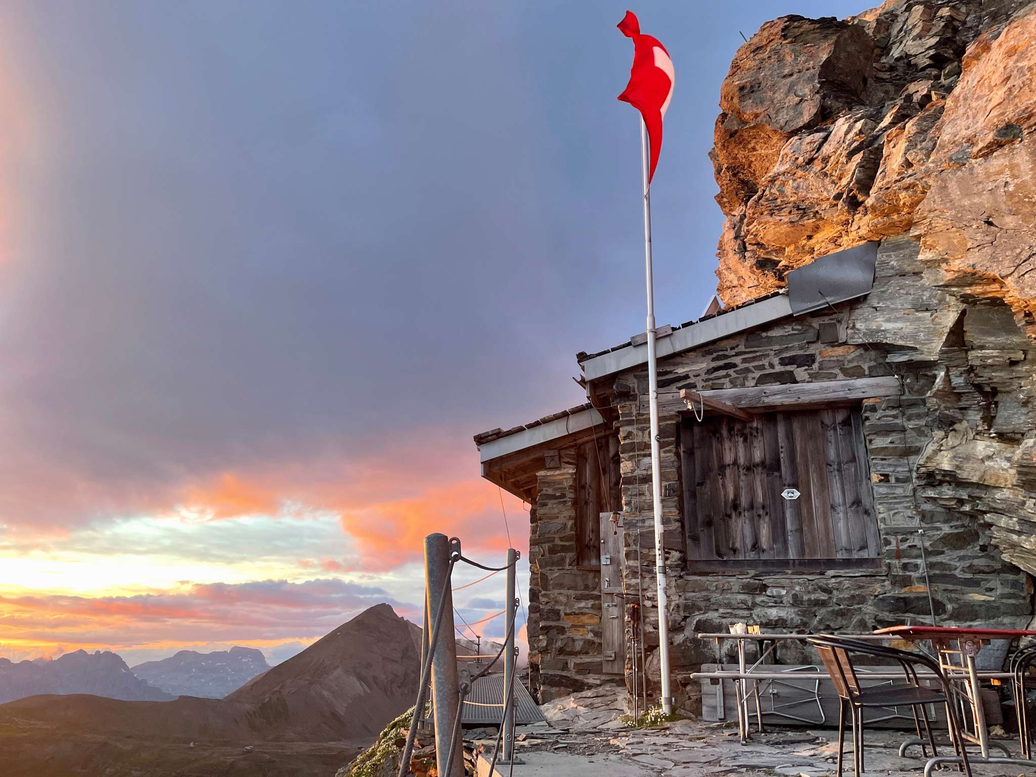 Wie ein Adlerhorst klebt die Kistenpasshütte auf 2714 m ü. M. am Felsen und bietet einen atemberaubenden Tiefblick auf den Limmernstausee und eine sagenhafte Aussicht auf Selbstsanft, Bifertenstock, Tödi bis zum Kaiserstock (SZ).