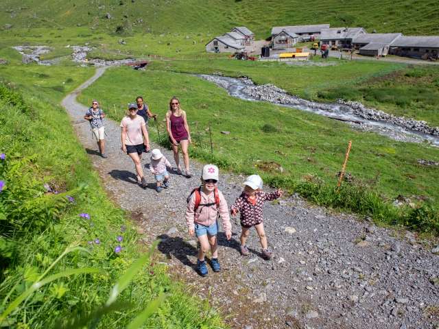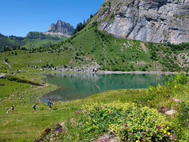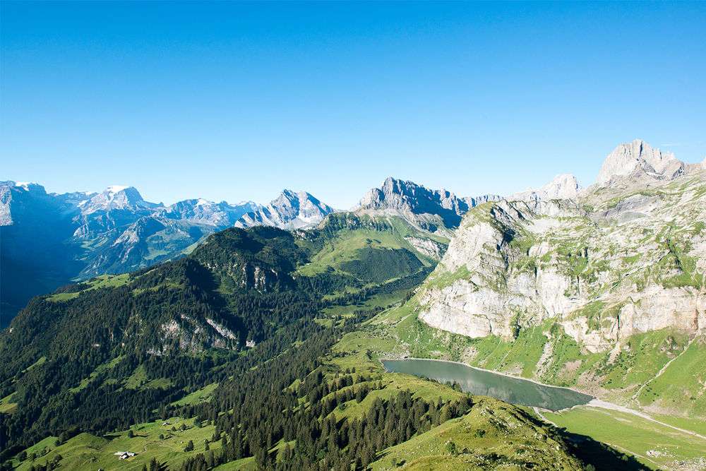 Hier heisst es Inne halten und sich von der atemberaubenden Kulisse verzaubern zu lassen. Laut hallt das Echo vom eindrucksvollen Glärnischmassiv zurück. Von dort geht es vorbei am Mittelstafel der Alp Oberblegi bergab zur Bergstation der Brunnenbergbahn.