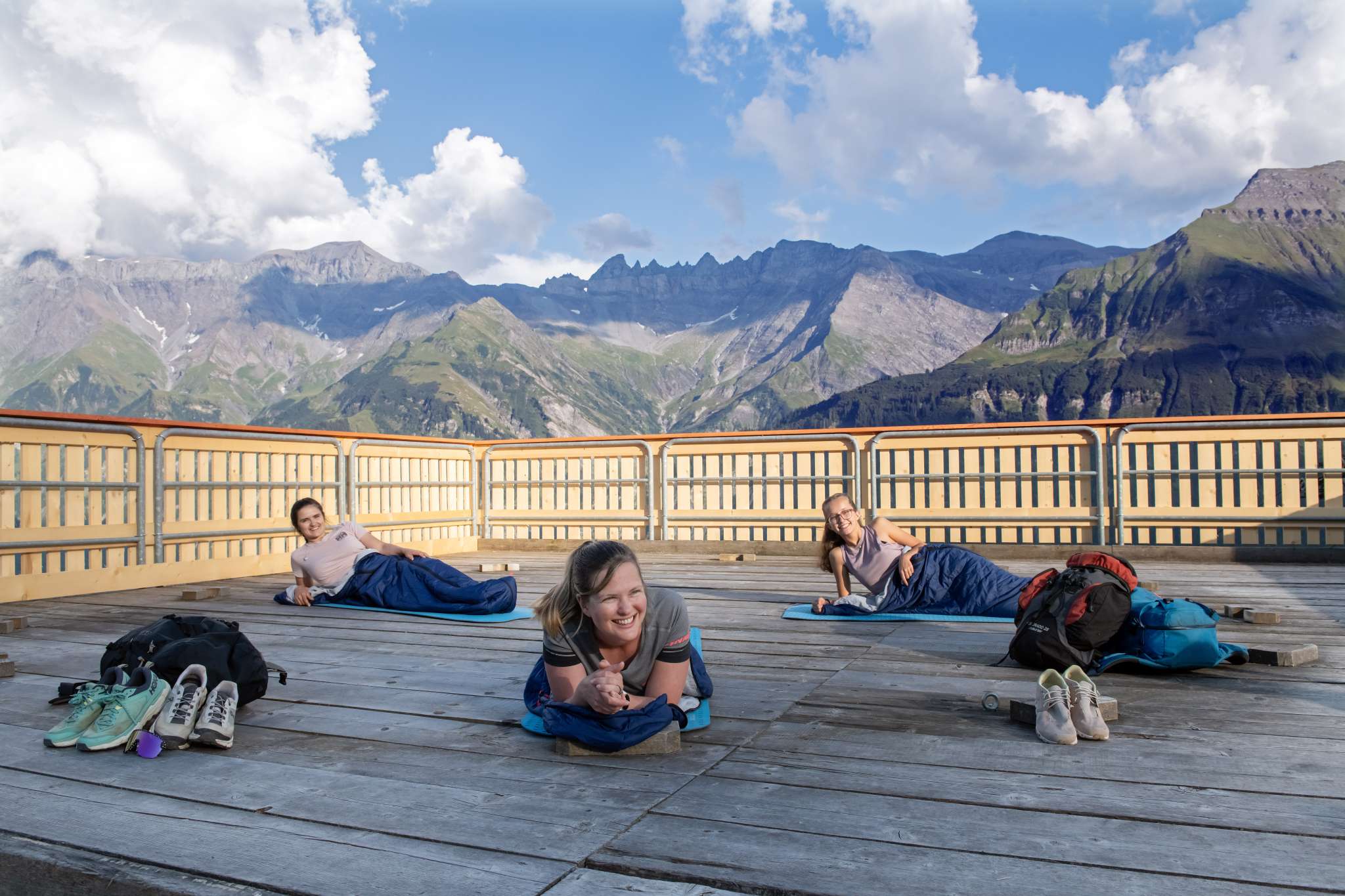 Die Holzplattform bietet einen schönen Blick auf das UNESCO-Weltnaturerbe Tektonikarena Sardona mit den Tschingelhörnern und dem berühmten Martinsloch. Das Kinderparadies vor dem Bergrestaurant mit den Riesentrampolinen, der Riesenschaukel, Kletteraction, Kegelbahn und dem Wasserspiel bietet genügend Möglichkeiten, um zufrieden und müde beim Einnachten mit Blick auf den Sternenhimmel im warmen Schlafsack einzuschlafen.