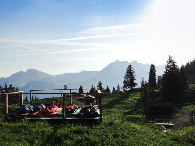 Bei diesem Gruppen-Erlebnis erkundest du am ersten Tag die Region Kerenzerberg über dem Walensee, entdeckst nach einer kurzen Wanderung die Ausflugsperle Talalpsee und erfährst dort vom GeoGuide Spannendes über die Geologie im UNESCO Welterbegebiet Tektonik Sardona. Das Abendessen kochen wir gemeinsam auf dem Feuer, anschliessend bereiten wir zurück auf der Alp Habergschwänd das Nachtlager vor. Ab dem Eindunkeln richtet sich der Blick durch das Teleskop nach oben: Unter Begleitung von einem versierten Astro-Guide erkunden wir das All, das sich über uns dunkel über dem Walensee ausbreitet. Die Nacht verbringen wir unter dem Sternenhimmel im Schlafsack.