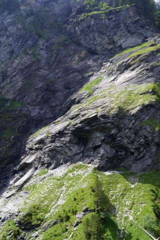 Der Bach hat sich tief in den leicht abzutragenden Tonschiefer der Flysch-Abfolge eingeschnitten und so die mächtigen Felswände freigelegt. Von der Sitzbank aus lässt sich eine deutliche Gesteinsfalte im Flysch erkennen, die von den enormen Kräften der Alpenbildung zeugt.