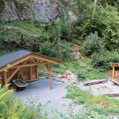 Die Heil- und Schwefelquelle liegt ca. 10 Minuten oberhalb der Talstation der Brunnenbergbahn .