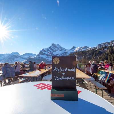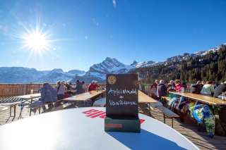 Die grosse Sonnenterrasse bietet dir einen atemberaubenden Rundumblick auf die schneebedeckten Glarner Berge und an kalten Tagen sitzt du im geheizten Kuppelzelt besonders gemütlich.