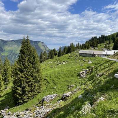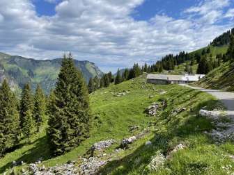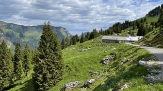 Der schöne Arvenwald etwas weiter oben lädt zum Verweilen, die Alphütten und somit das Alpleben sind ganz nah.