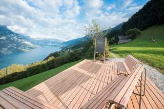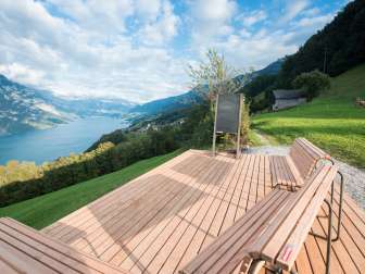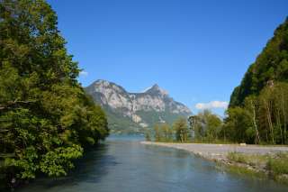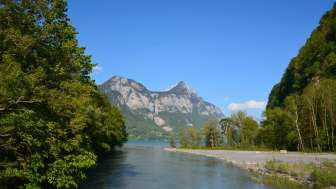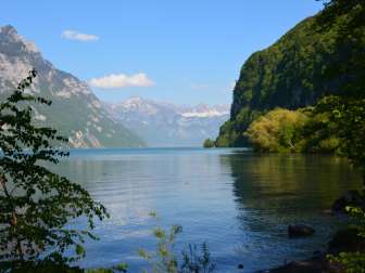 In Filzbach, it then goes down a zig-zag path to Lake Walen at the very front of the foothills of the Kerenzerberg. The water at the fountain can be drunk. When you reach the road, turn left. A detour to the left at the bridge is worthwhile: The Gäsi attracts with beautiful sandy beaches.