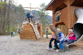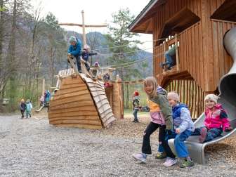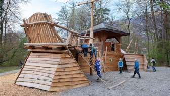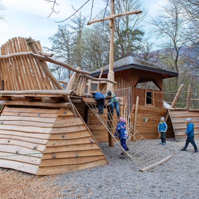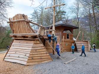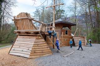 At the center of this spacious playground is the large, capsized ship, which lies there with a broken bow. It can be climbed, balanced, shimmying, bouldering, etc. in a variety of ways.