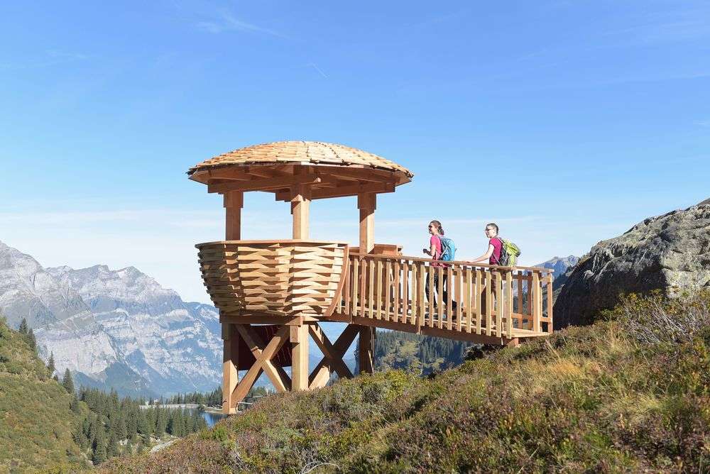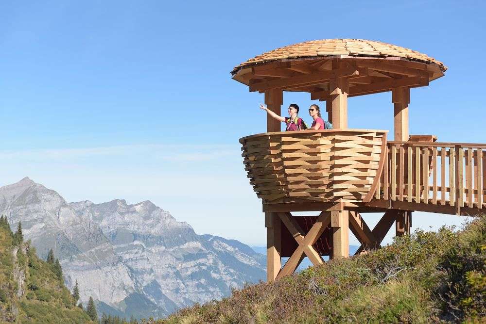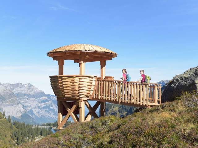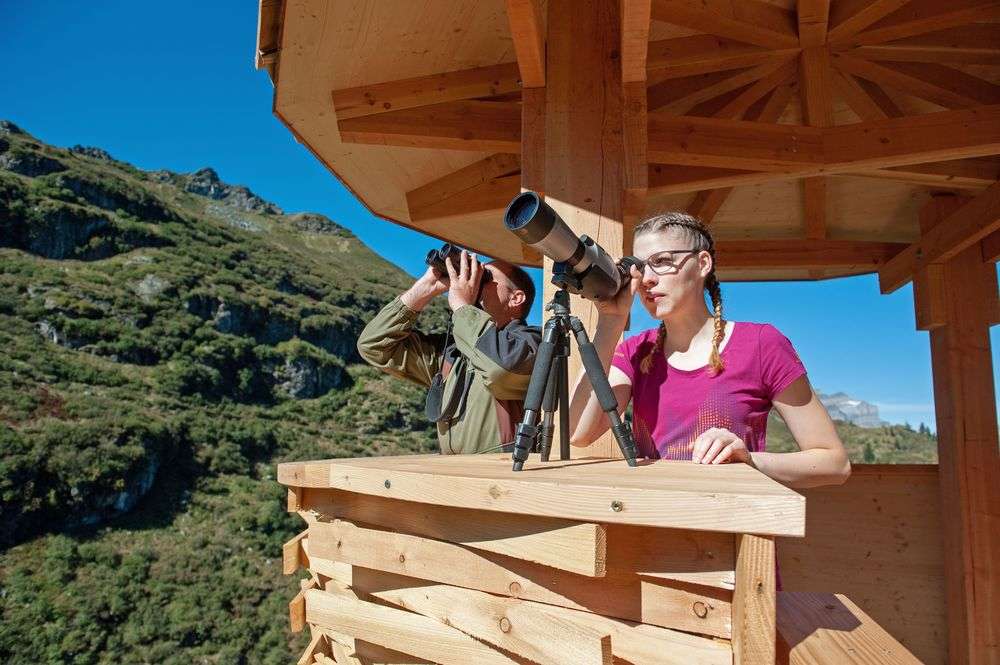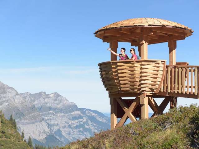 Oversized bird's nests on the Mettmen-Alp (Widerstein and Oberstafel) and Bischofalp are readily accessible, providing fascinating information about the wildlife in the Freiberg Kärpf. It is only about 20 minutes from the Bischofalp mountain hotel to the wildlife observation station. You can reach the observation points within 45 to 60 minutes of hiking time from the respective cable car station.